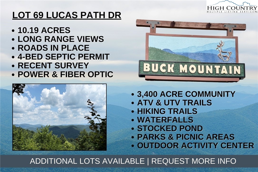 - Directions: From Boone: Follow US-421 S. Turn left on Pumpkin Run Rd. Follow for approx. 1.4 miles. Turn right on Buck Mountain Rd. After the security gate, stay straight on Buck Mtn Rd, then keep right to stay on Buck Mtn Rd. At the fork, stay left to Bobcat Mtn Rd. Follow Bobcat Mtn Rd to the cul-de-sac, then left and IMMEDIATE right on Lucas Path Drive. 337 Lucas Path Dr. (Lot 69) on left. See real estate sign.