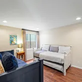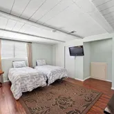1st floor has living area for watching movies with pull out couch for sleeping- 2 full bedrooms, street side bedroom has 2 twins beds and 1 trundle and oceanfront bedroom has queen bed and full bathroom.