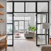 Off the living room is arguably one of the home’s best features: the highly coveted family room enclosed by beautiful custom glass and steel casement doors. This room could easily be programmed as a large home office, a playroom or a fourth bedroom with tasteful millwork and tons of built-ins.