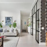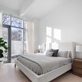 A long hallway leads to the home’s three bedrooms. The master bedroom features two walk in closets, a luxurious master bath with a walk-in-shower for two, Nero Marquina marble, a brand new custom double vanity and additional custom storage. The second and third bedrooms are equally generous in size and they share a full bathroom with a tub shower combo, a brand new custom vanity and integrated laundry and linen closets. Both the master and second bedroom have direct access to the private outdoor space and the entire home features 7’’ white oak floors, stunning Italian lacquer closets, a powder room, central A/C & heat, and ultra-quiet soundproof windows.