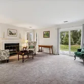 The dining room, accented by triple windows, flows seamlessly into a spacious family room filled with natural light and centered around a wood-burning fireplace. Sliding glass doors lead from the living area to a serene fieldstone patio, creating the perfect setting to relax and enjoy the quiet, private surroundings.