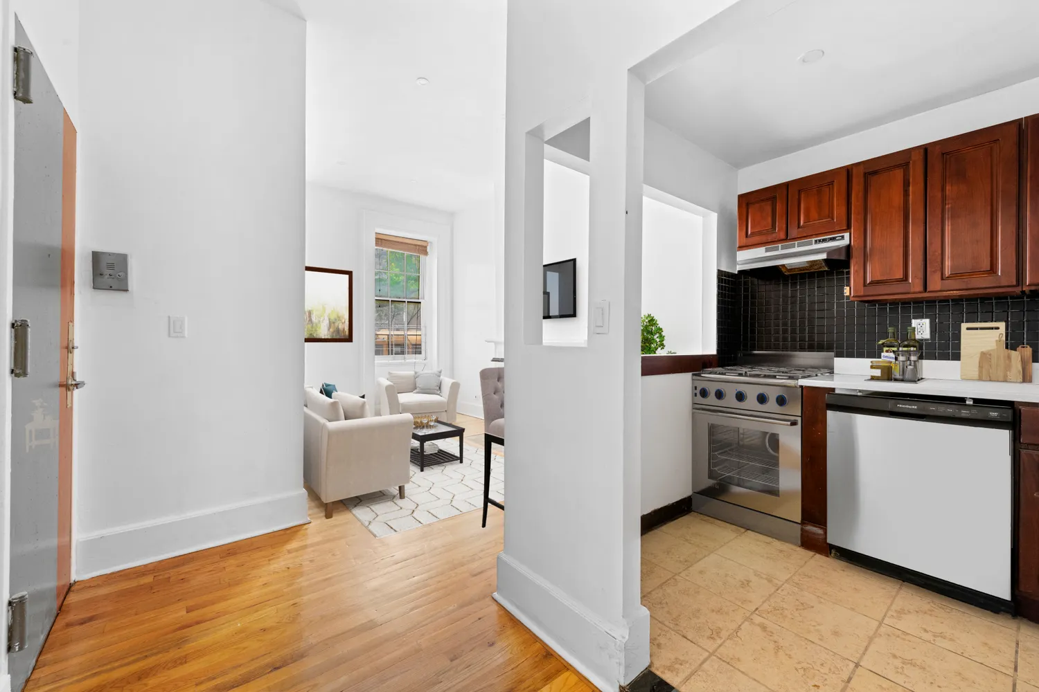 Only one flight up, this contemporary one bedroom has an open kitchen, queen sized bedroom and 3 closets. The kitchen has a new stainless stove and dishwasher. The three windows overlook a trio of gorgeous 100+ yr old non-residential buildings.