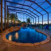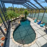 - Pool Features: Chlorine Free, Deck, Gunite, Heated, In Ground, Lighting, Salt Water, Screen Enclosure, Solar Heat
