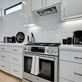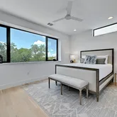A first-floor guest suite with its own en suite bath offers flexibility for visitors, a home office, or additional living space. The second level serves as the heart of the home, where an open kitchen and living area are framed by oversized picture windows overlooking a canopy of mature trees, filling the space with soft natural light and a calming sense of privacy. Crisp white cabinetry, stainless steel appliances, and a generous island anchor the kitchen, creating an inviting setting for both everyday living and effortless entertaining. Upstairs, the primary suite and an additional bedroom provide a quiet retreat from the home’s social spaces.