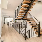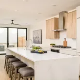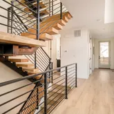 The main level features open-concept living ideal for entertaining, with a dedicated home office, powder bath, and expansive living and dining areas framed by floor-to-ceiling windows. The designer chef’s kitchen is anchored by a waterfall quartz island, custom cabinetry, panel-integrated appliances, a 6-burner gas range with griddle, and statement range hood. Sliding glass doors connect seamlessly to a private rear patio, enhancing indoor-outdoor living. Wide-plank white oak flooring and the architectural staircase elevate the modern aesthetic.