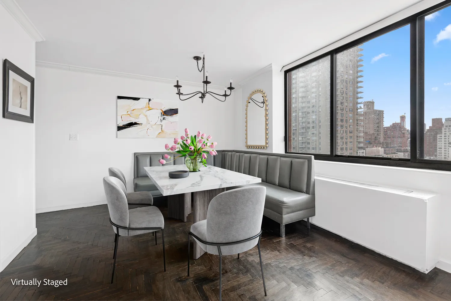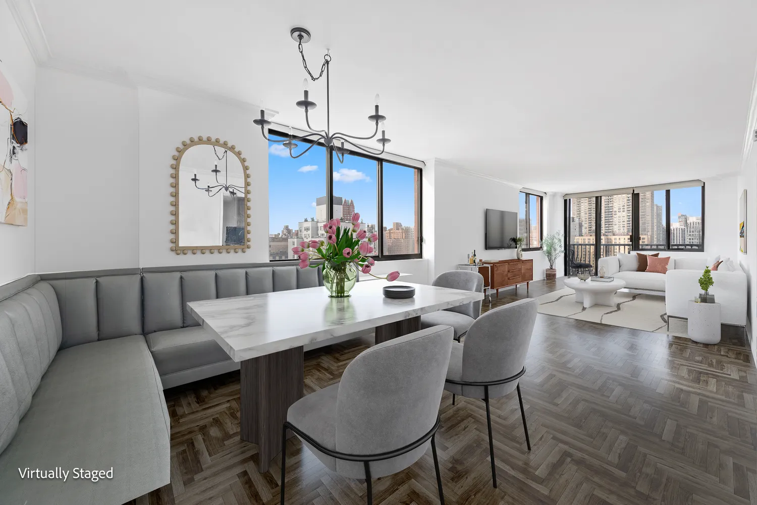 Must see UES Gem in the Sky! Come and tour this stunning 2BD/2BA corner unit with sweeping views of New York city. This home offers a gracious layout with ample space for a designated dining area and built-in banquet seating. The expansive 34-foot living room opens on to a large private terrace and is surrounded by oversized windows. The space enjoys plenty of light throughout the day with unobstructed northwestern views of the city, and a majestic cityscape that twinkles at night.