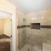 Luxury vinyl plank flooring runs throughout the living areas, kitchen, and bathrooms, while the bedrooms and hallway feature deep-pile Stainmaster carpeting. Recessed LED lighting is installed in the kitchen, living room, and hallway. Both bathrooms have been remodeled, with a walk-in tiled shower with bench in the primary bath and a full-size tub in the secondary bath. Laundry is located inside the unit.