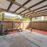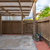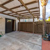 The property includes a private, approximately 350 sq ft fenced patio with a custom pergola, lighting, irrigation, and direct access to a private two-car garage with an automatic door, plus nearby guest parking.