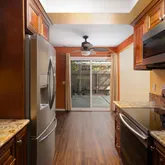 The unit was completely renovated in 2020 and includes an updated electrical panel, plumbing, and wiring, as well as dual-pane windows and a sliding glass door. The kitchen features solid-wood custom cabinetry, granite countertops, under-cabinet LED lighting, and stainless-steel appliances, including a slide-in electric range with a convection oven, a vented microwave hood, a dishwasher, and a counter-depth French-door refrigerator with a dual icemaker and water system.