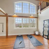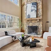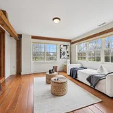 The heart of Briarcroft is the extraordinary converted barn wing, which boasts a luminous, atrium-like expanse spanned by four levels of exposed post-and-beam craftsmanship. In the open-concept living and dining area, a dramatic floor-to-ceiling stone fireplace sets a luxurious tone. The accompanying kitchen spares no amenities, highlighting dual dishwashers, a Wolf cooktop, two ovens, and two sinks. A finished basement—complete with a half bath and exits on three sides—adds yet another layer of versatility. Above, the barn’s upper stories reveal a serene primary bedroom, an indulgent ensuite with multiple shower heads and a clawfoot tub, plus additional living quarters.