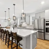 - Kitchen Features: Breakfast Bar, Breakfast Room, Cabinets White, Eat-in Kitchen, Kitchen Island, Pantry Walk-In, Solid Surface Counters, View to Family Room