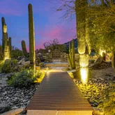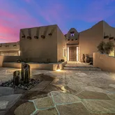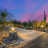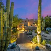 A meandering walkway through pristine desert landscape, adorned with majestic Saguaros, leads to a welcoming courtyard...Stunning Santa Fe Estate with Panoramic Black Mountain & City Light Views