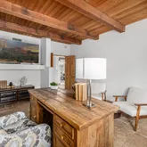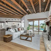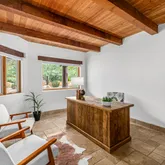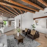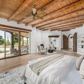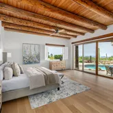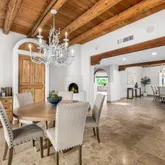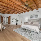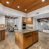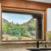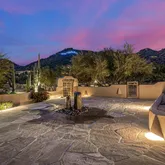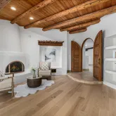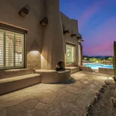 A meandering walkway through pristine desert landscape, adorned with majestic Saguaros, leads to a welcoming courtyard featuring a stone fountain and kiva fireplace. Step through custom knotty alder doors into the family room, where rustic elegance comes alive with new hardwood floors, a striking stacked stone fireplace, and a wet bar. Viga beams and Latillas enrich the ceilings above, while expansive windows frame spectacular mountain, city light, and desert vistas stretching to the southern horizon. Primary Suite Retreat: