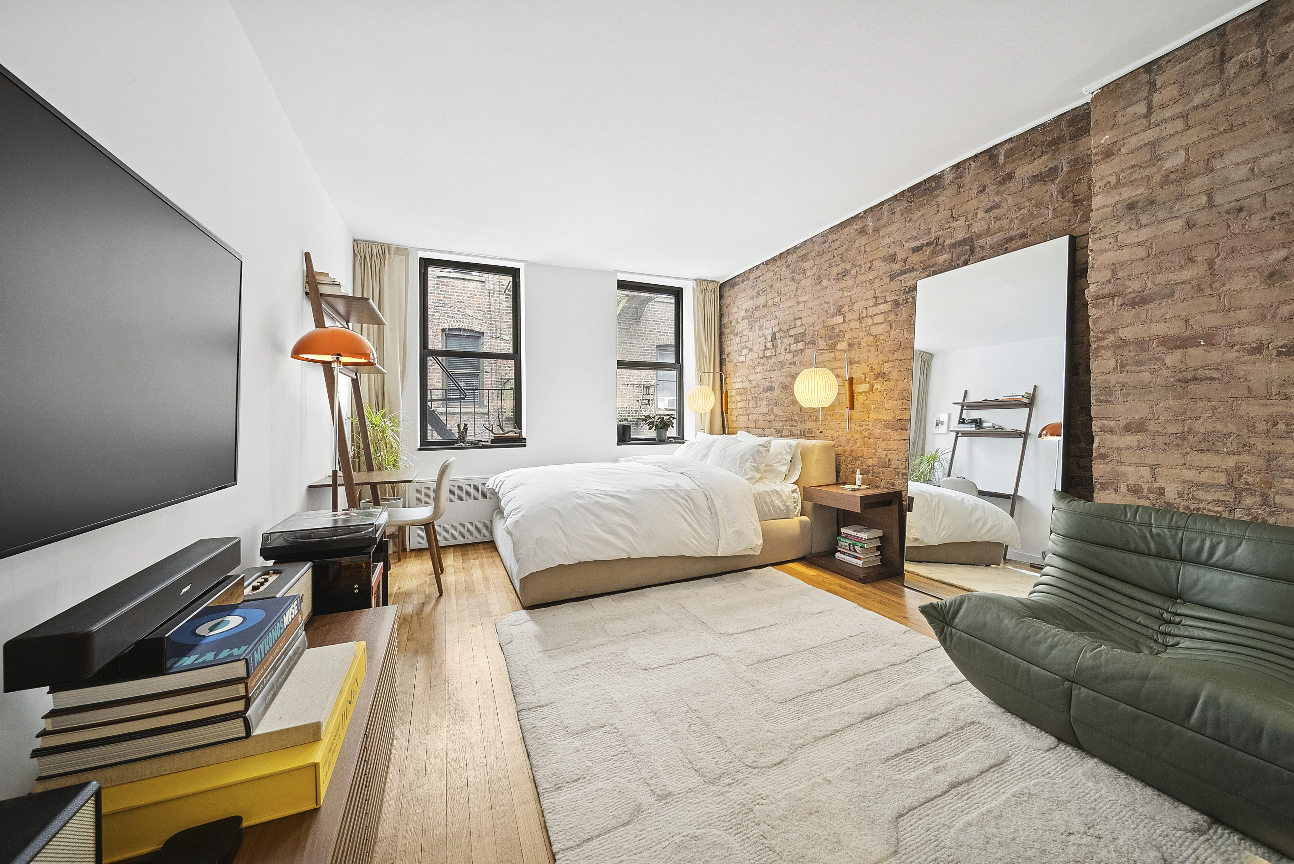 The apartment is a spacious, open modern studio blending prewar character with contemporary finishes. Highlights include exposed brick, hardwood floors throughout, a generous walk-in closet, and a sleek modern kitchen.