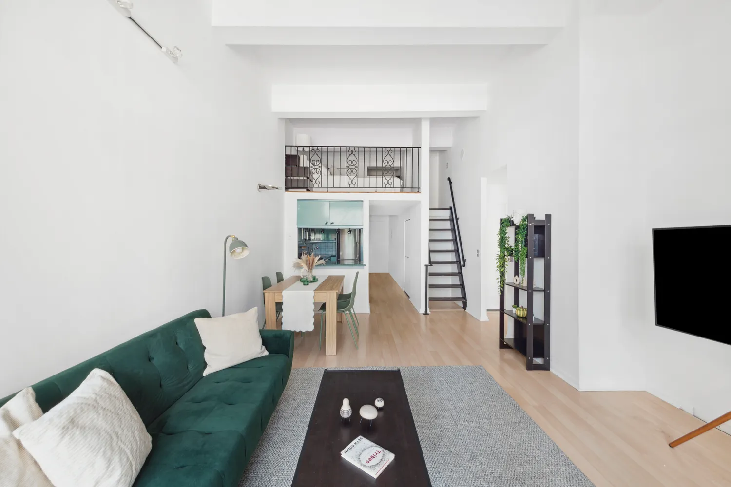Featuring soaring 13-foot ceilings and floor-to-ceiling windows that flood the space with natural light. The expansive king-sized primary bedroom easily accommodates a home office setup, offering both comfort and functionality. Upstairs, you'll find a spacious queen-sized loft—perfect as a second sleeping area or additional office space—with a large closet for extra storage.