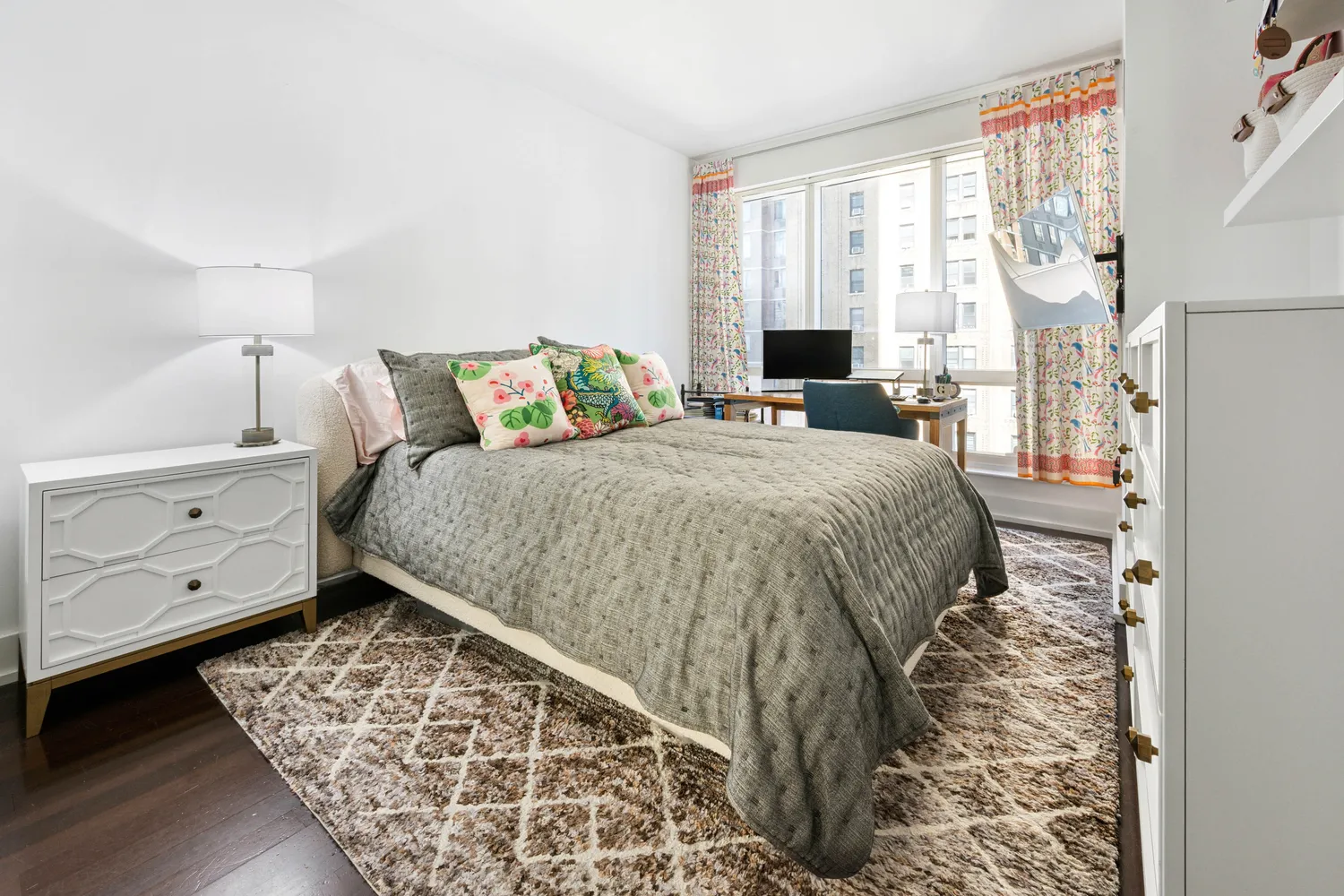 The spacious bedroom comfortably fits a queen-size bed with two nightstands and features ample closet and storage space, providing a peaceful retreat from the city’s energy. The spa-inspired bathroom boasts modern finishes, a deep soaking tub, and elegant fixtures, adding a touch of luxury to your daily routine.