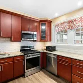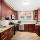 The spacious formal dining room sets the stage for memorable family gatherings. Meanwhile, the ultra-modern kitchen promises to delight any chef, featuring state-of-the-art appliances, gas cooking, granite countertops, and tall cherry cabinetry, offering ample storage in this eat-in kitchen. Adjacent to this culinary haven is a delightful deck, an idyllic spot for enjoying warm spring, summer, and fall evenings in comfort.