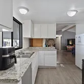 spacious kitchen with spacious cabinets, sleek countertops, and big windows that fill the space with natural light. The inviting living room is perfect for