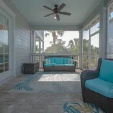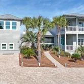 From the moment you arrive, the salty sea breeze and lush tropical landscaping welcome you to your dream getaway. This two-story beach retreat features double-decker wrap-around porches, providing the perfect spot to sip morning coffee or unwind in the evening. Step inside to find bright, beachy décor and an open-concept layout, seamlessly connecting the living room, dining area, and fully equipped kitchen—ideal for entertaining. The first-floor primary suite offers a king bed, spa-like en suite bathroom with a soaking tub and walk-in shower, plus private access to the backyard oasis. Upstairs, discover four more beautifully appointed bedrooms, including a second spacious suite with a king bed, private kitchenette, and access to the second-floor porch. A bunk room for the kids, additional queen bedrooms, and multiple updated bathrooms ensure plenty of space and comfort for every guest. Bonus Spaces - Pool House & Carriage House