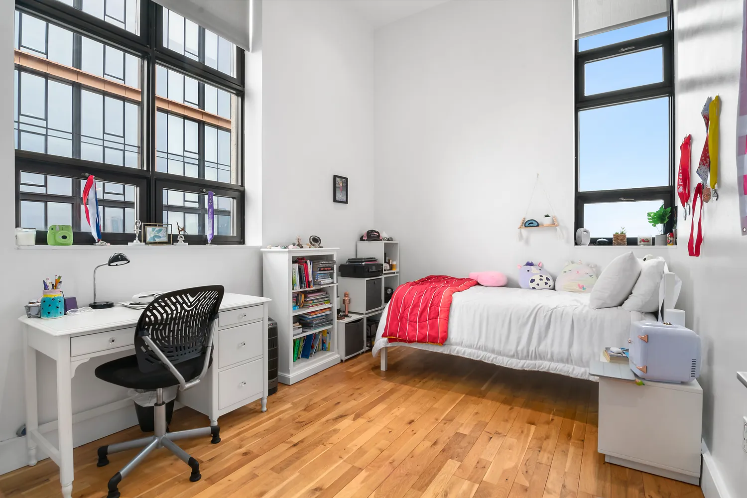 The beautiful large Primary bedroom also has a huge window letting light...Beautiful ~1,709 SF, 3-bedroom, 2-bathrooms plus a home office stunning apt at One Brooklyn Bridge Park Condominium. Drenched in western light, with New York Harbor, a stunning skyline views with spectacular sunsets too.