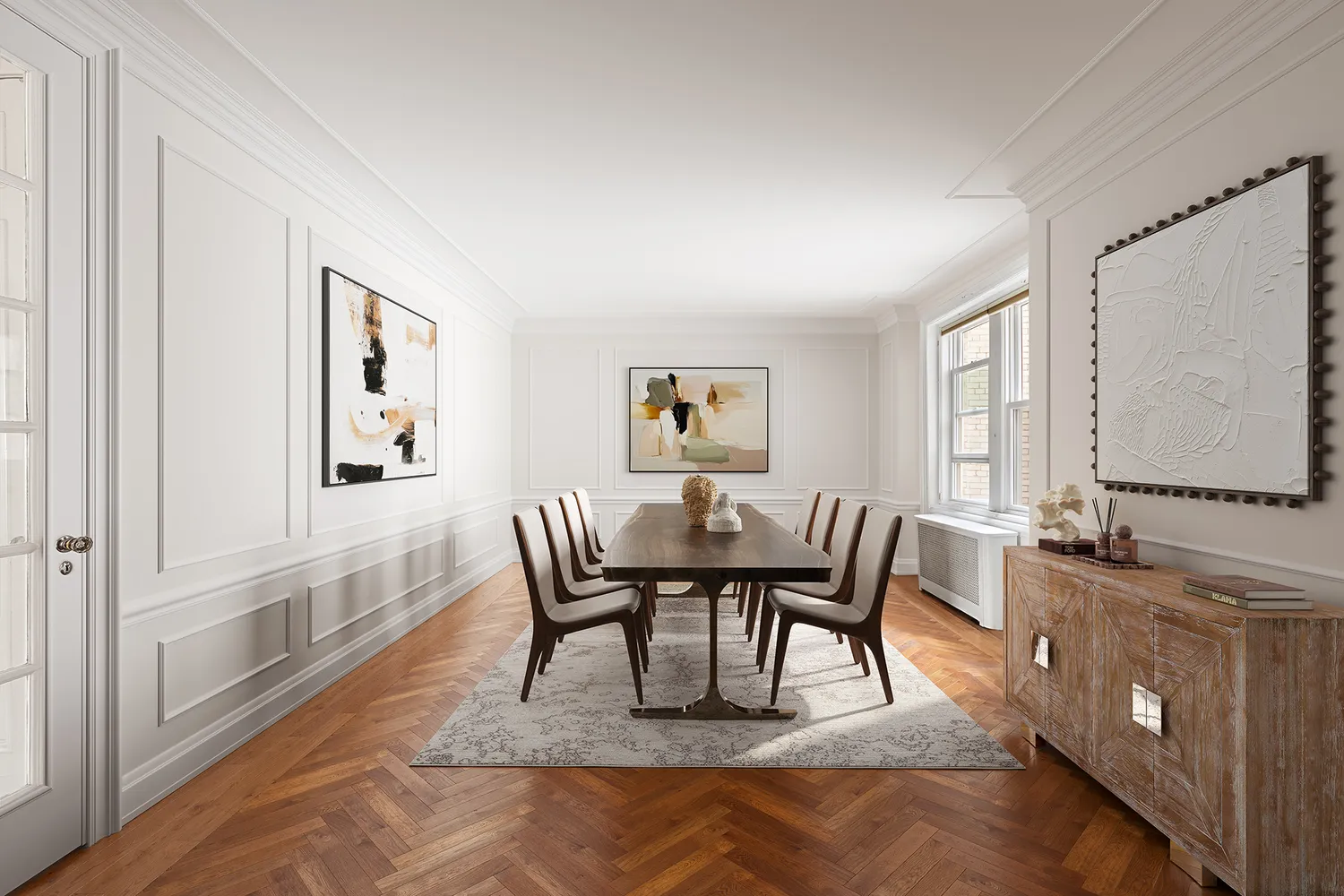 The beautifully articulated...A superb and luminous Classic Seven corner residence overlooking Riverside Park and the Hudson River, with western and southern exposures that fill the apartment with sunshine all day and deliver breathtaking sunsets. A semi-private elevator landing opens to the entry foyer and spacious center hall gallery. Perfectly proportioned living room with high floor river views and an oversized dining room that easily functions as a commodious library or comfortable family room.