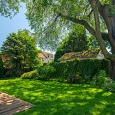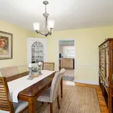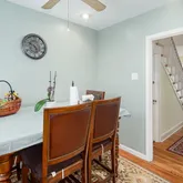 Accessible from the main foyer, a large formal dining room features a classic built-in china cabinet, decorative chair rail, and the same original hardwood floors, which can be found throughout most of the main floor. Just down the hall is the spacious kitchen with tons of storage and a large peninsula for additional prep space. The kitchen also boasts stunning views of the yard from a large window above the sink and access to a private patio with room for oversized outdoor furniture and a grill, perfect for al fresco dining in the warmer months. The main floor is completed by a cozy breakfast nook.