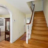 The second floor of the home enjoys three ample-sized bedrooms, including the dreamy primary suite and two full bathrooms. The spacious primary suite showcases plush carpeting, an oversized walk-in closet, and a private en suite bathroom. The second and third bedrooms boast charming refinished hardwood floors and large closets, and the third bedroom has a secluded balcony overlooking the property, ideal for enjoying your morning cup of coffee. On the lower level of the home, you will find a large finished basement with space for a secondary living room or home gym, storage space, and a bar area for entertaining guests. The basement also has a private half bathroom for your convenience.