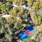 A circular drive leads to a 3-car garage. Expansive grounds feature a 25-meter half-Olympic swimming pool, spa, lighted pickleball court, soccer field, and sauna.