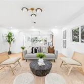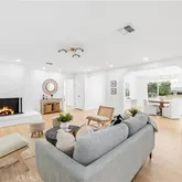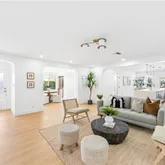 Step through the impressive entryway into an expansive, light-filled living space designed for both everyday comfort and unforgettable entertaining. The open-concept layout flows seamlessly into a stunning chef’s kitchen anchored by a dramatic 9-foot island wrapped in double Taj Mahal honed quartz waterfall edges, with seating for four. Custom cabinetry, all-new appliances, and thoughtful design details make this kitchen as functional as it is beautiful. Double doors open directly to the tranquil backyard oasis, complete with turf, swaying palms, and a soothing waterfall fountain - creating effortless indoor-outdoor living. Architectural archways and designer fixtures throughout the home add warmth and character, while the oversized formal dining room provides the perfect setting for gatherings large and small.