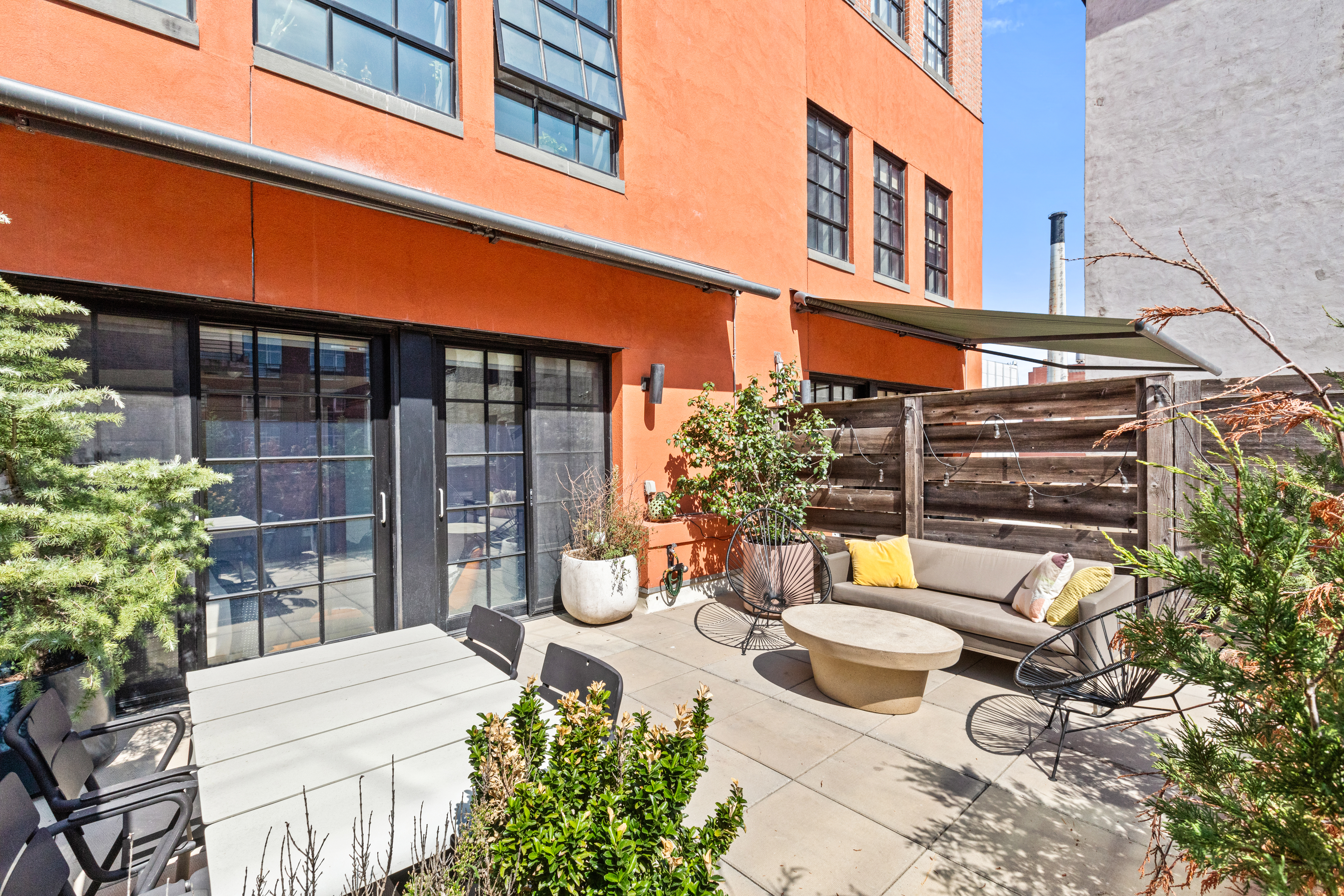 This home blends historic character with modern design. Floor-to-ceiling windows and sliding glass doors connect both levels to private outdoor spaces: a balcony off the living room and a secluded terrace upstairs with a retractable awning. The modern kitchen features a Bertazzoni range, Caesarstone counters, and bar seating that's perfect for entertaining.