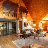The residence encompasses approximately 7,000 square feet and is defined by substantial log construction and generous proportions throughout. The home includes four bedrooms and 4.5 bathrooms, along with a substantial number of additional flexible rooms, several of which are presently configured to accommodate extended family and guests, allowing the overall sleeping and use capacity of the home to extend well beyond the legal bedroom count.