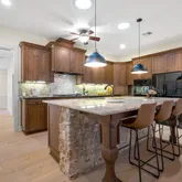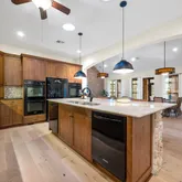 - Room Description: Oversized island; Pendent lighting; 2x ovens; 2x diswashers; Gas cooktop, Knotty Pine Cabinetry, Appliance garage; Under-cabinet lighting;