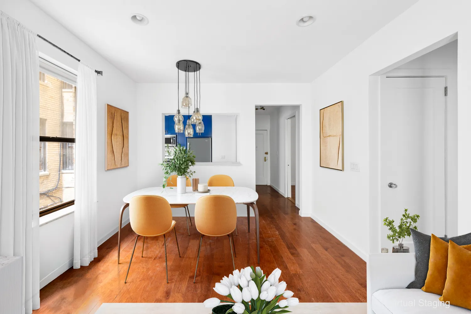 Throughout this lovely home are 9 ft ceilings, recessed lighting, updated electric, engineered hardwood floors, generous closets, skim-coated walls and 3 exposures!