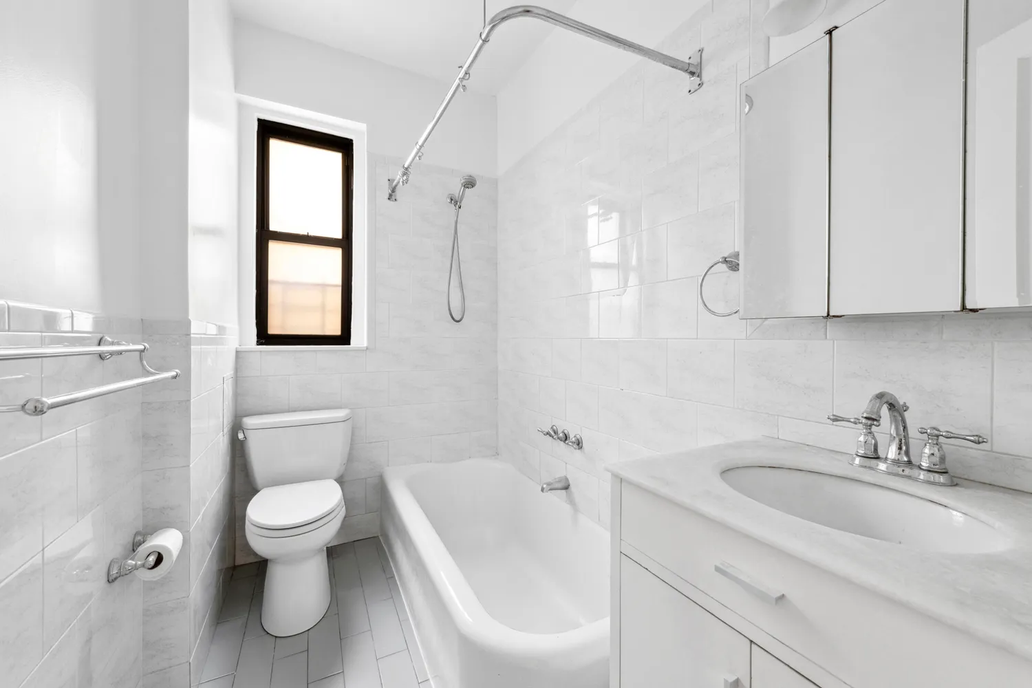 The windowed bathroom is also renovated with new fixtures and marble top vanity while retaining the original deep cast-iron soaking tub.