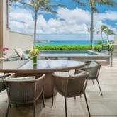 Expansive wall-to-wall glass doors create seamless indoor-outdoor living, opening to a spacious lanai with dining and lounge areas overlooking the golf course and ocean. Upstairs, the primary suite offers a luxury ensuite bath and a private ocean-view lanai. Two additional guest suites provide comfort for additional family and guests.