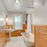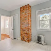 Ascend to the second floor, where the master bedroom steals the show with its exposed brick accent. Two additional bedrooms and a large full hall bath, featuring a claw-footed tub and built-in shelves, complete the second level.