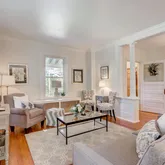 Upon arrival, you'll be greeted by the beautiful front porch, complete with a swing, setting the stage for relaxation. Step through the welcoming entry foyer to discover a harmonious blend of old-world charm and contemporary updates. The newly refinished original hardwood floors, floor-to-ceiling windows, and high ceilings create an inviting atmosphere throughout.