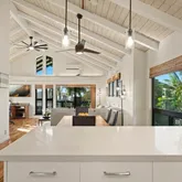 The upper level includes the living room, open kitchen, primary bedroom, and a lanai overlooking the stunning...Lani Lei Hale is located in one of Princeville’s most desirable neighborhoods, this beautifully maintained home offers an inviting, updated feel throughout. The main living area features high‑pitched ceilings and a newly remodeled modern kitchen that opens seamlessly to the living room, creating a bright and airy gathering space. Split‑system A/C is installed in every room for year‑round comfort.