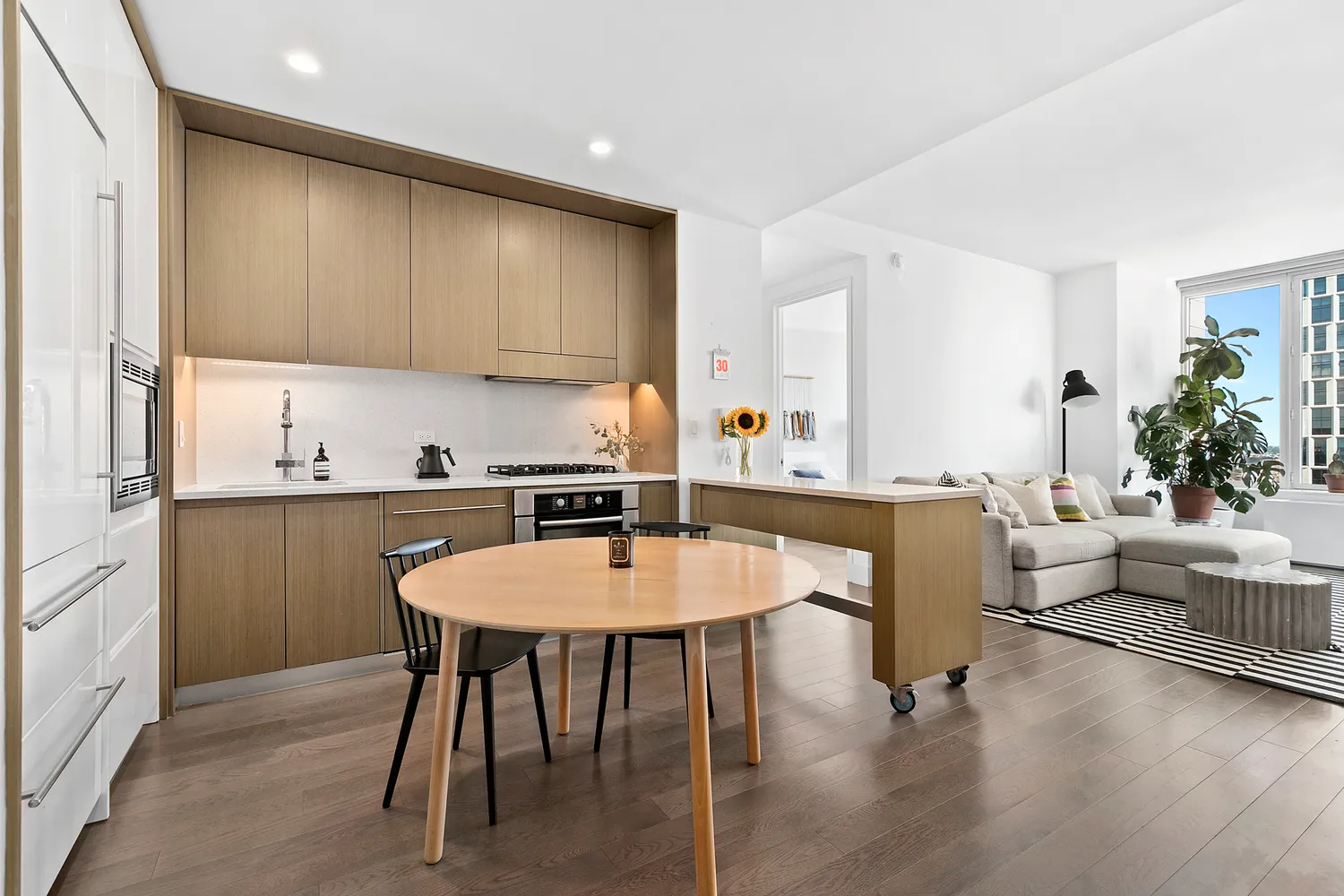 The kitchen is beautifully integrated into the living space and outfitted with a Summit refrigerator, Viking gas cooktop, and Bosch convection wall oven, microwave, and dishwasher. White quartz countertops and backsplashes, warm grey walnut cabinets, and an ingenious rolling island give residents the flexibility to alter the function of the kitchen into a social gathering space, cooking center, or cocktail bar.