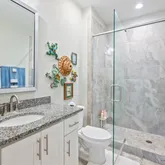 • Frameless glass shower doors in all three bathrooms for a sleek, spa-like aesthetic