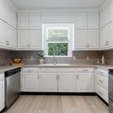 - Kitchen Features: Cabinets White, Solid Surface Counters, View to Family Room