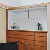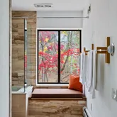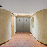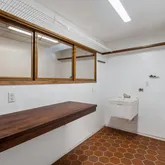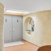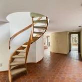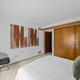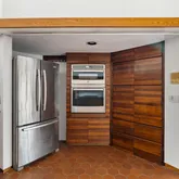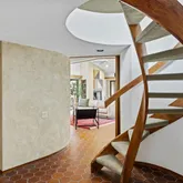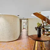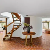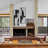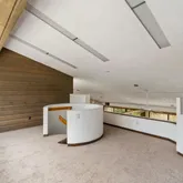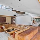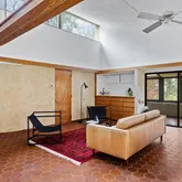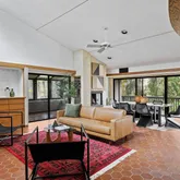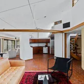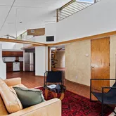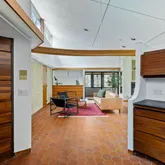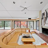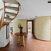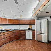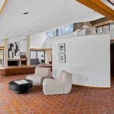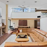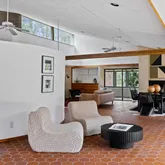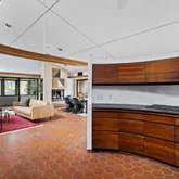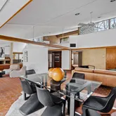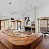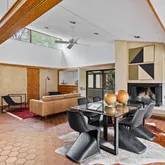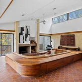Signature details showcase Stein’s creativity and craftsmanship. A dramatic spiral staircase, crafted in wood, leads to a serene loft space that floats above the main living area. The circular kitchen is both playful and functional, with original details that reflect Stein’s eye for form. The expansive living room anchors the home with bold architectural gestures—a sunken conversation pit with its own fireplace, a custom built-in sofa, soaring ceilings, and a modernist corner hearth that adds visual balance and warmth.
