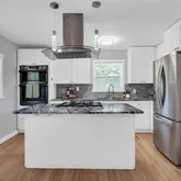 - Kitchen Features: Cabinets White, Stone Counters, Kitchen Island, Eat-in Kitchen