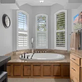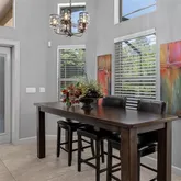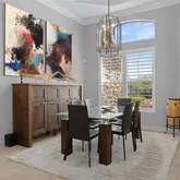 - Interior Features: Built-in Features, Ceiling Fan(s), Crown Molding, Eating Space In Kitchen, High Ceilings, Kitchen/Family Room Combo, Living Room/Dining Room Combo, Primary Bedroom Main Floor, Solid Surface Counters, Solid Wood Cabinets, Split Bedroom, Stone Counters, Walk-In Closet(s), Window Treatments
