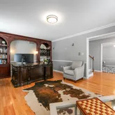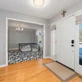 Step inside to find hardwood floors and tastefully updated interiors throughout the main level. The inviting foyer leads to a versatile sitting room currently used as a home office, featuring custom built-in cabinetry and natural light. The formal dining room flows seamlessly into the spacious eat-in kitchen, making entertaining effortless. Just beyond, the warm and neutral-toned living room showcases a cozy fireplace and a french door that opens to the backyard and deck.