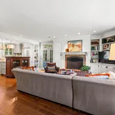 At the heart of the home is the updated kitchen, which boasts luxurious Calcutta Gold marble countertops, custom cabinetry, and top-of-the-line appliances. It’s a chef’s dream and offers ample space for meal preparation and family gatherings. The family room, located off the kitchen, is a cozy space with built-ins and a charming wood-burning fireplace, making it ideal for casual family time or entertaining. Adjacent to the family room is a well-thought-out mudroom with cubbies and cabinets, providing a perfect spot for organizing coats, shoes, and bags as you come and go.