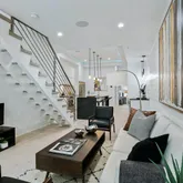 Step inside to an open-concept living area bathed in natural light, featuring soaring ceilings, rich hardwood floors, and sleek contemporary finishes. The gourmet kitchen is a chef’s delight, boasting quartz countertops, high-end stainless steel appliances, custom cabinetry, and an oversized island—ideal for entertaining.