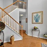 Step through the spectacular front door, and into a two-story foyer with sweeping marble floors and a dramatic switchback staircase that sets the tone for what’s ahead.