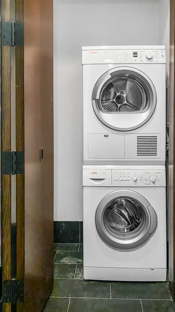 Pocket doors reveal the primary suite with an ensuite spa bathroom featuring a soaking tub, shower, double wide vanity and private water closet. The secondary Bedroom/Home Office, has a roomy closet, and easy access to the well-appointed full guest bathroom. A hall closet and an in-unit Bosch washer-dryer complete this impeccable home in the sky.