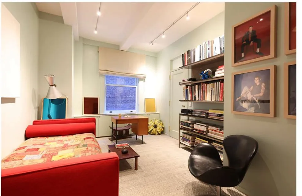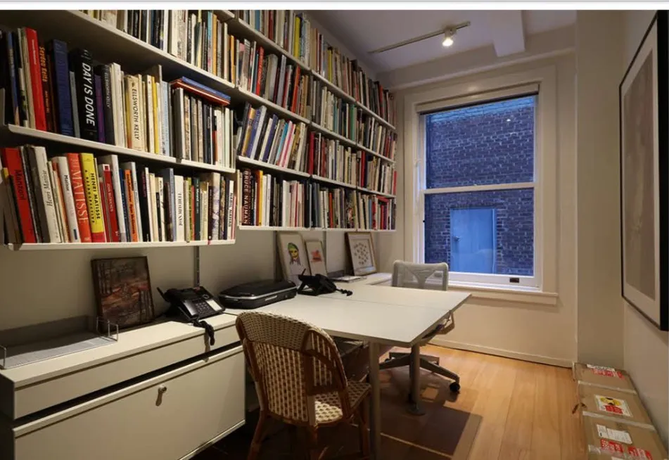 A large bedroom wing offers a grand primary suite with a private sitting room facing South and East, fully carpeted with shelving, art, tables, chairs, books, lamps and TV. A spacious second bedroom also with a large TV provides a chaise, more art, custom shelving, wall to wall carpet and access to its own private bathroom. There's, a large third room dedicated as an office where two can easily sit at the desks and work with one another. There are a total of two-and-a-half beautifully renovated bathrooms. Every room has been thoughtfully designed, showcasing impeccable craftsmanship and timeless style.
